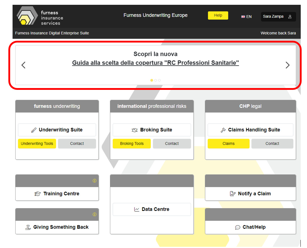 Perché il portale fides (Furness Insurance Digital Enterprise Suite) è anche uno strumento di comunicazione, dove il nostro Gruppo pubblicherà tutte le novità offerte e gli aggiornamenti, evidenziati nel banner scorrevole.