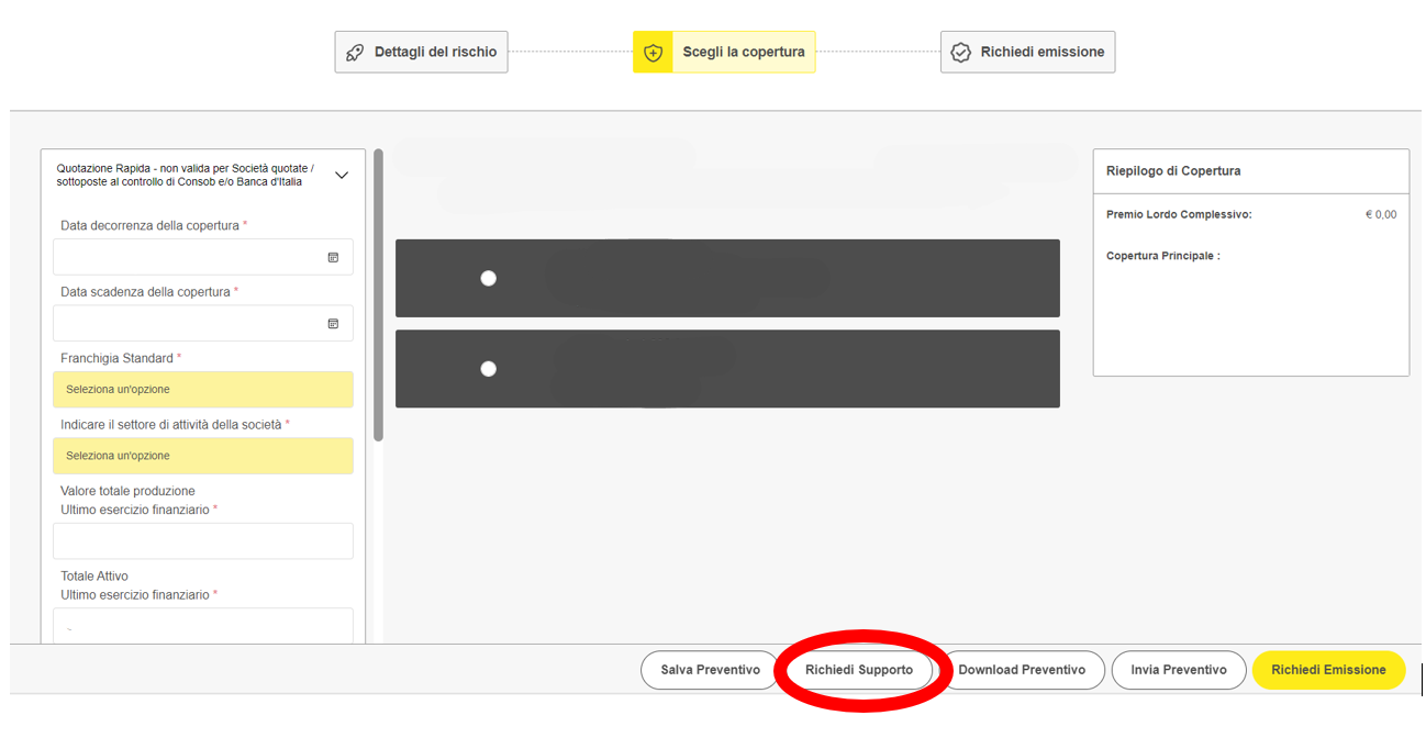 Il tasto Richiedi Supporto è una funzione che vi permette di entrare in contatto direttamente con l’Ufficio Assunzione al fine di poter richiedere eventuali extra (appendici, massimali etc.) o anche semplicemente per un consiglio tecnico.
